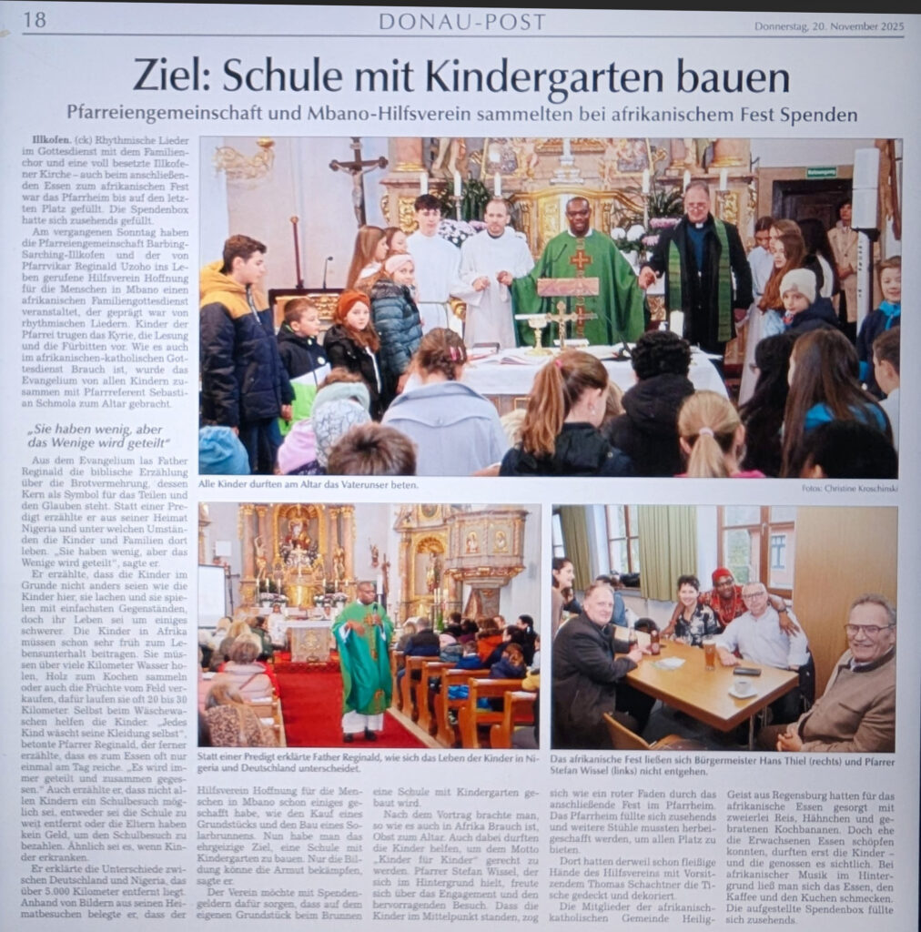 Pfarrer Reginald organisierte einen Familiengottesdienst für Kinder und Jugendliche in der Pfarrkirche Illkofen. In der Kirche machte er einen Bildervortrag und erzählte vom Leben und den Schwierigkeiten der Kinder in seiner Heimat Nigeria. Später gab es im Pfarrheim afrikanisches Essen, Musik und kleine Geschenke für die Kinder. Das Motto war „Kinder für Kinder“. Wir danken allen Kindern, Eltern und allen Gästen des Tages für das zahlreiche Erscheinen und die schönen gemeinsamen Stunden.