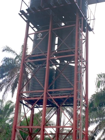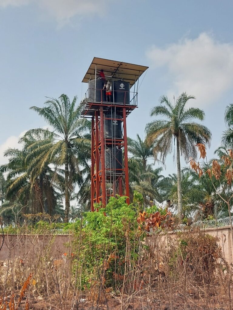 Erst einmal musste das Fundament betoniert werden, damit die 8 mit Wasser zu füllenden Geepee Tanks mit je 750 l Füllvermögen den Stahlträgern auch Stand halten. Parallel wurde gebohrt. Als die große Bohrmaschine ins Dorf kam, herrschte eine unglaubliche Begeisterung – so eine Maschine hat noch nie jemand gesehen. Für uns fremd und unvorstellbar, dass man mit diesem Gerät 100 Meter tief bohren konnte.